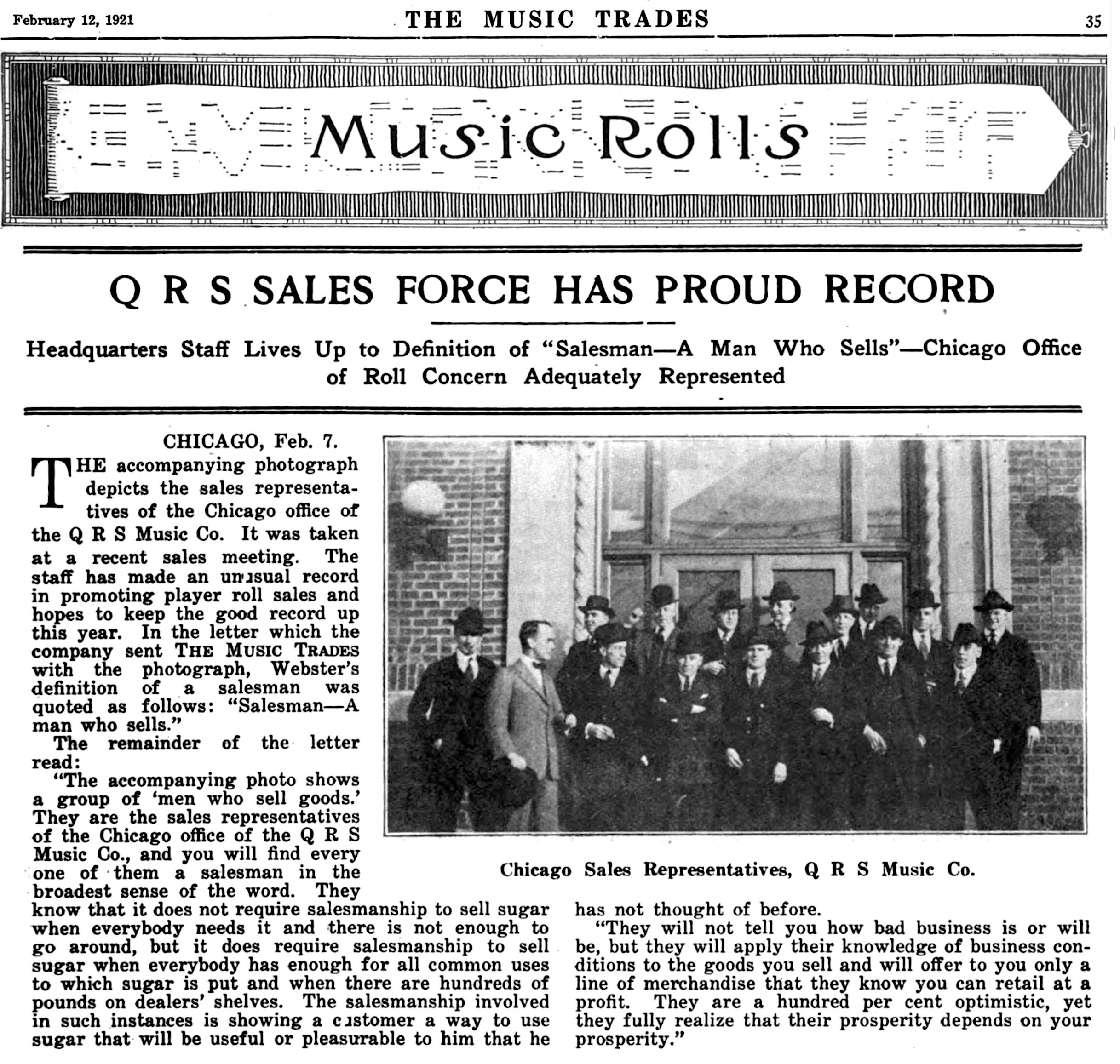 “The factories of the Q-R-S Music Co. in Chicago and New York are working night and day at present and expect to keep up this pace for some time to come,” the Music Trades reported in 1921. Thomas Pletcher was quoted in the story adding that, “Whatever other factories are doing, ours are running on time and overtime.” This was a veiled reference, perhaps, to the fact that new options in home music entertainment—specifically the radio—weren’t causing any concern in the QRS house.