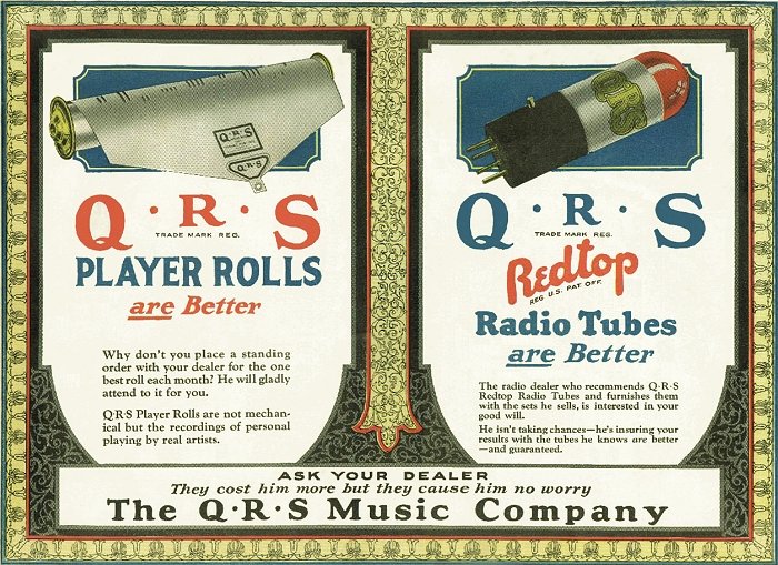 In the early ‘20s, the company started making its own piano roll cabinets, speakers, and portable phonographs, but had little luck carving out a new niche. Pletcher also established a potentially lucrative partnership with the Chicago company that would soon be known as the Zenith Radio Corp, taking over the manufacture of their CRL receivers and developing a line of “Red Top” radio tubes. Zenith’s president, Eugene F. McDonald, even made Pletcher a vice president at the radio firm for a few years, but when the QRS factory proved unable to keep up with Zenith’s growing demands, the working relationship sputtered out.