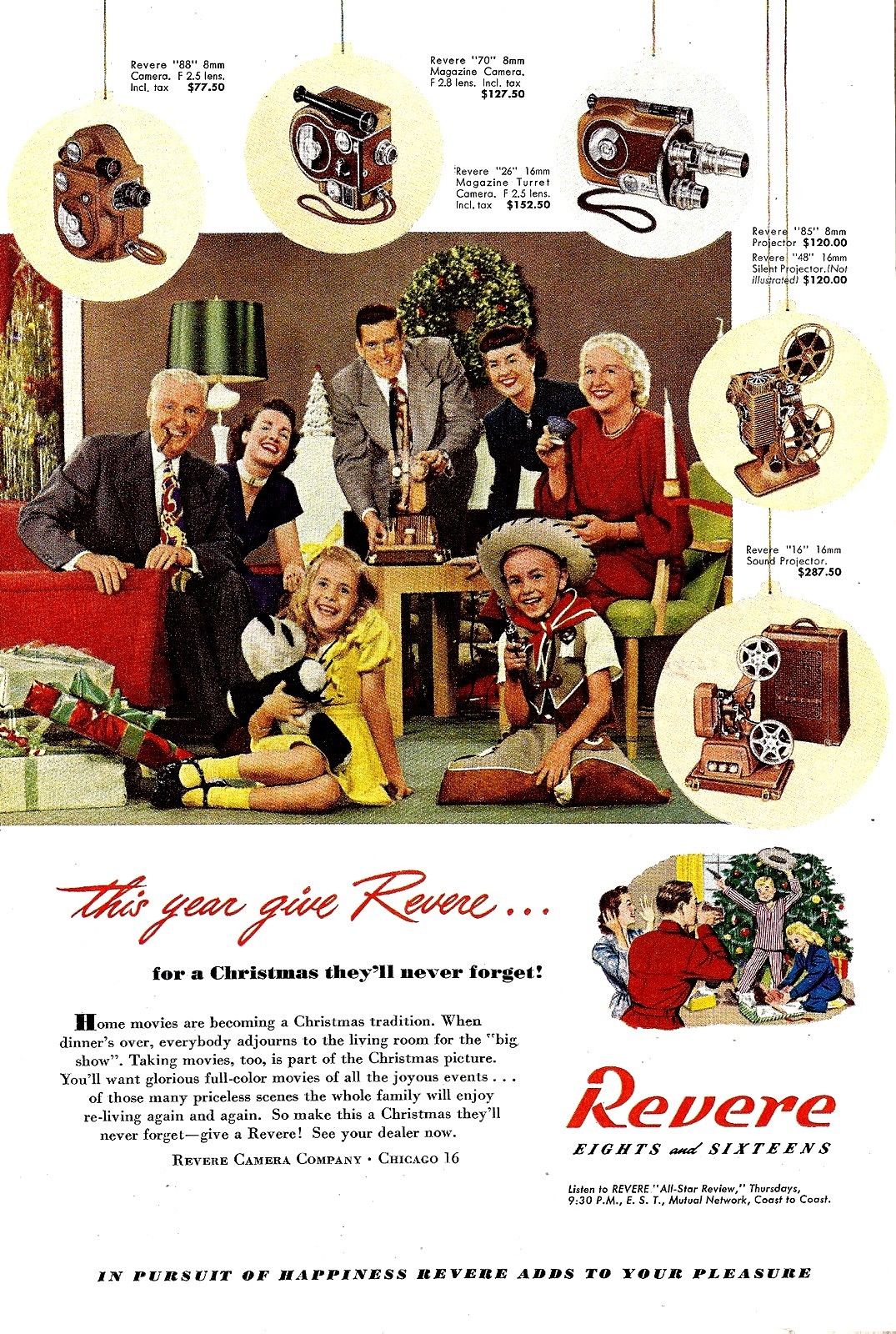 “The Revere takes the clearest and steadiest home movies you have ever seen. Its advanced design (pocket size), its exclusive automatic film-threading sprocket, five speeds (including slow motion), precision construction, and many other proven features make Revere the outstanding value of 8mm movie cameras.”