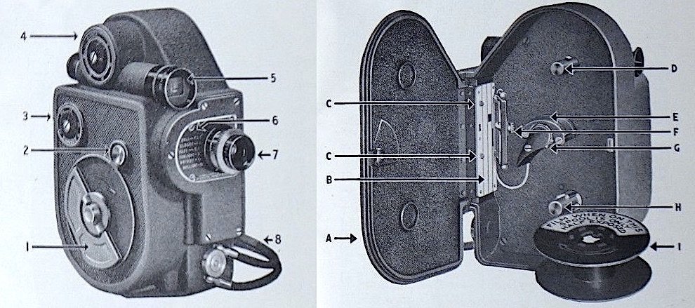 [Parts of the Model 88 Camera: 1-Winding Key, 2-Operating button, 3-Speed control dial, 4-Adjustable footage meter, 5-Objective view finder, 6-Lens plate, 7-Lens, 8-Wrist cord. A-Camera door, B-Aperture Plate, C-Film Guides, D-Upper spindle, E-Sprocket guide, F-Film gate catch, G-Sprocket, H-Lower spindle, I-Take-up spool]