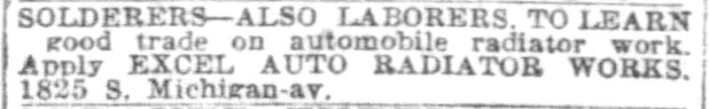 The Excel Auto Radiator Company [sometimes incorrectly called the “Excel Radiator Company”] started operations in the early 1920s, and soon benefited from Samuel’s skillful salesmanship. Headquartered at 1827 S. Michigan Avenue through its first decade, the company managed to win contracts with Sears-Roebuck, Montgomery Ward, and Western Auto, leading to rapid growth and additional plants in Dallas, Kansas City, Oakland, Minneapolis, and Philadelphia.