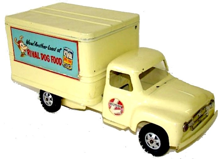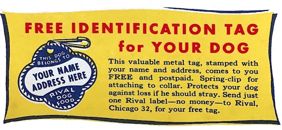 The use of special promotions increased, too—from the official sponsorship of a Rival Dog Food softball team to special free give-aways of brass identification tags for dog collars. There were also Rival toy delivery trucks and, of course, those awesome coin banks. On TV and radio, the Rival Dog Food jingle began worming its way into the brains of unsuspecting men and women, exploiting the genius of Johann Strauss to sell cylinders of meat to animals: “Gimme Rival Dog Food. Arf Arf.” The song was sung, incidentally, not by cartoon dogs, but by the velvety voiced Skip Farrell, with “arf arfs” performed by radio actor Paul Barnes.