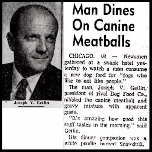 In 1962, keeping with the spirit of the Katz era, Rival held a press conference in which it would introduce its new “meatballs for dogs” by having a trained poodle named Snowdrift eat the delights right there at the podium in a swank hotel ballroom. Unfortunately, Snowdrift was not inspired by the dish presented to him/her, and Joseph Getlin was left in a predicament. Like any good corporate exec, he lowered himself to the occasion, taking a bite of a meatball himself, then proclaiming, “It’s amazing how good this stuff tastes in the morning.”