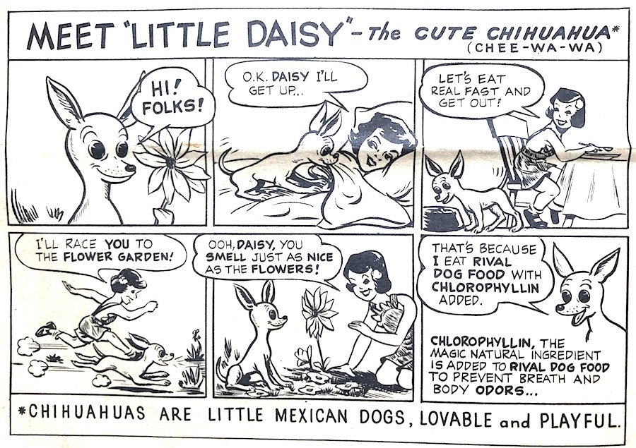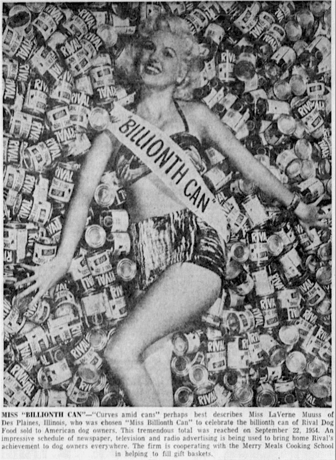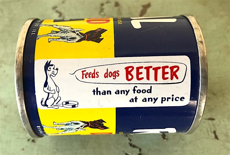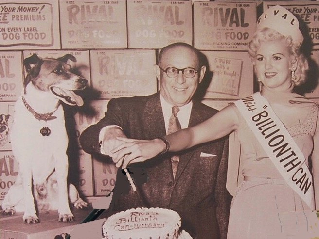 In 1954, someone at Rival calculated the company must have produced something like a billion cans of dog food by now, and an official promotion was somehow made out of that, as well, touting that Rival had sold “enough cans to circle the earth 2-1/2 times.”