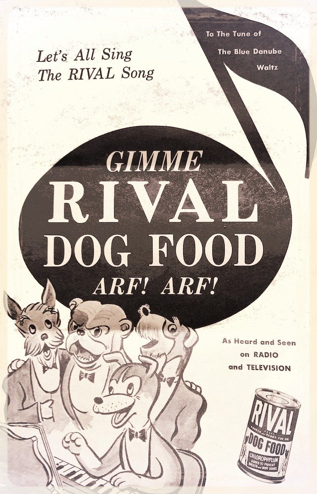 No can dog alive today can remember what Rival Dog Food tasted like. And hopefully no human can either. But many still remember that jingle, so much so that they can’t hear the “Blue Danube Waltz” without adding the arf arfs.