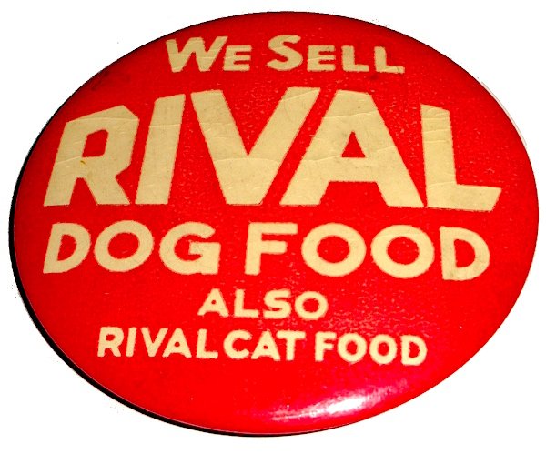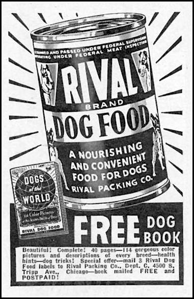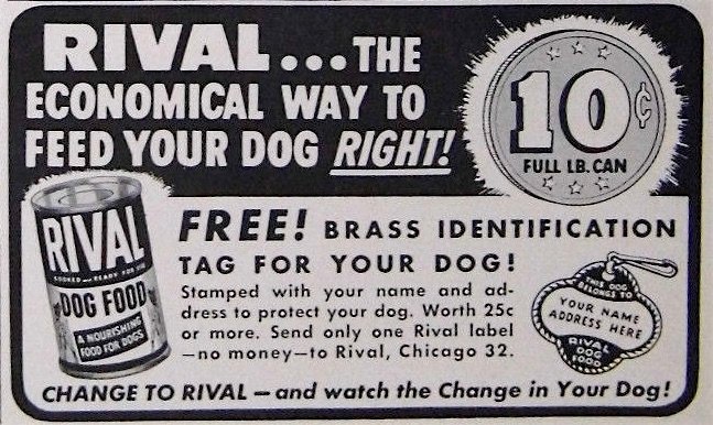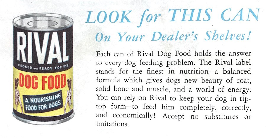 “Rival blends meat and other ingredients scientifically—under strict laboratory control—and conducts year-round feeding tests in its own kennels to prove results. The makers of Rival devote all their time, facilities and resources to the canning of Rival Dog Food, with the single purpose of feeding your dog correctly!”