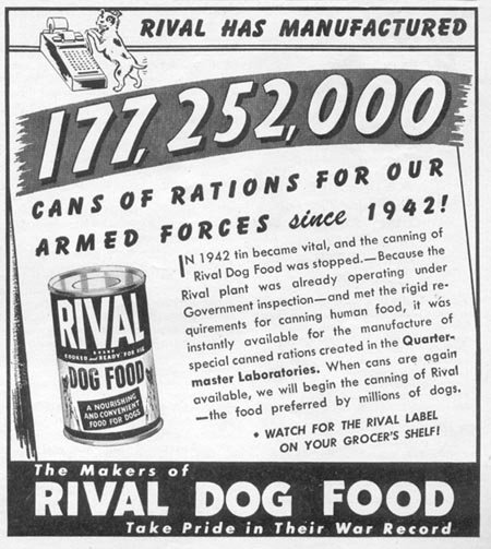 “Rival Has Manufactured 177,252,000 Cans of Rations for our Armed Forces since 1942!” read one advertisement in 1945. “In 1942 tin became vital, and the canning of Rival Dog Food was stopped. —Because the Rival plant was already operating under Government inspection—and met the rigid requirements for canning human food, it was instantly available for the manufacture of special canned rations created in the Quartermaster Laboratories. When cans are again available, we will begin the canning of Rival—the food preferred by millions of dogs. Watch for the Rival Label On Your Grocer’s Shelf!”
