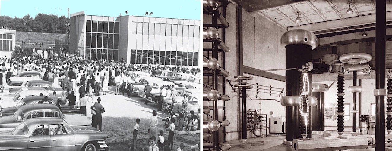 [Left: Grand opening of the Nicholas J. Conrad Laboratory at S&C’s Rogers Park complex, part of the company’s 50th anniversary in 1961. Right: Inside the NJC lab, where products could now be tested at voltages from 2,500 to 1.6 million volts (courtesy of S&C Facebook page)]