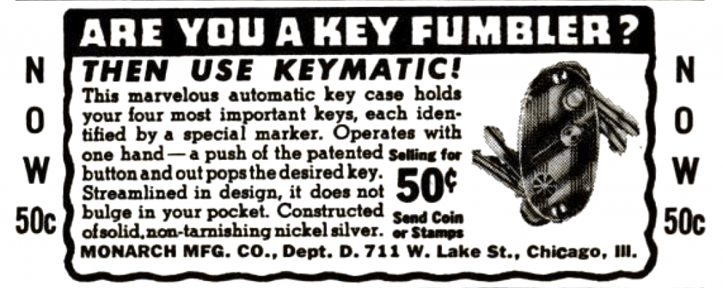 [The Keymatic, one of Jack Galter’s early products with the Monarch MFG Co, in an ad from 1939]