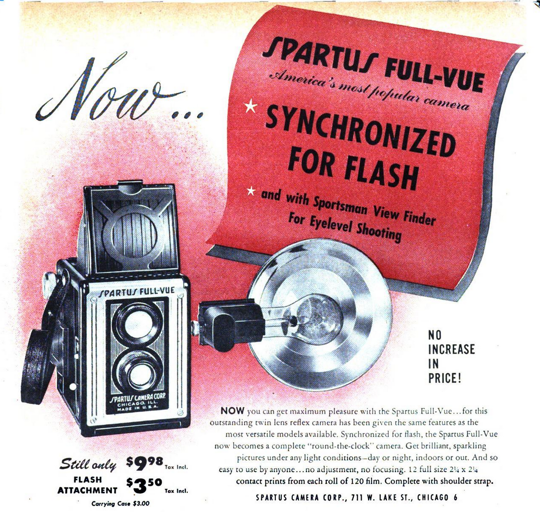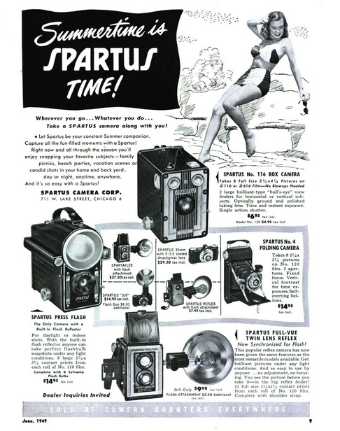 As for the camera featured on this page—the Spartus Full-Vue box camera—it was introduced about 10 years into the company’s existence, in the late ‘40s. Jack Galter had shut down the Monarch MFG Co. during World War II, and his main focus shifted to Spartus brand products, which—for some god forsaken reason—were initially advertised under the banner of “The Spencer Company.” Finally, in 1948, right around the time our Full-Vue camera was making its debut, Galter dropped the Spencer name and changed the camera manufacturing wing of his empire to the “Spartus Camera Corporation.”