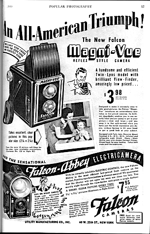 [Pictured: The Utility MFG Co. of New York manufactured its own view-finder box camera, the Falcon Magni-Vue, before suddenly becoming the Utility MFG Co. of Chicago in the early ’40s]
