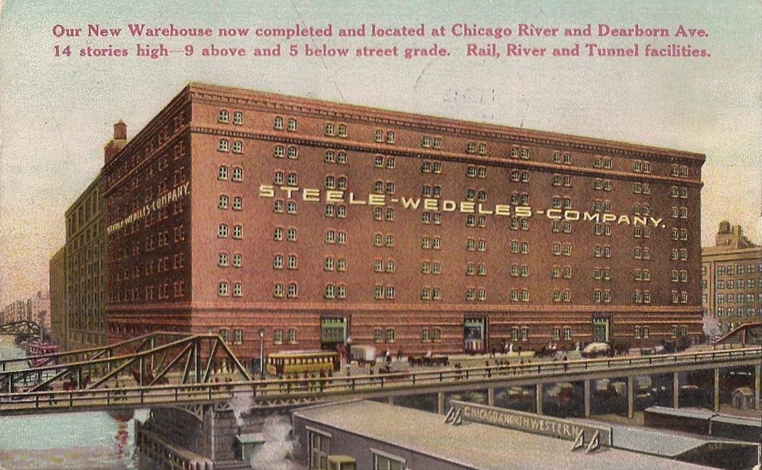 2) Not mentioned, but visible in the photo of the building, is the S-W dock on the Chicago River. Barges (ships?) from far and wide dropped off product there. Family lore has it that a deck hand fell into the river and my much loved grandfather, Leo Steele, jumped in and saved him.