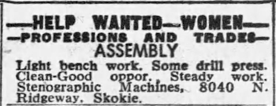 Aaaaanyway, we might never know for sure where our specific little Stenograph rolled off the assembly line, but by the early 1950s, things became a lot simpler to track. After moving its corporate headquarters to 318 S. Michigan Avenue in 1950, Stenographic Machines Inc. ended its relationship with Hedman two years later, and finally established its own manufacturing plant in Skokie at 8040 Ridgeway Avenue [Frank believes they might have poached a couple workers from Quality Hardware in the process].