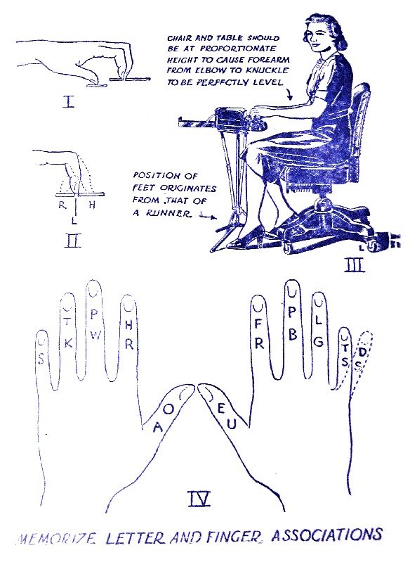 [An overview of the Stenograph keyboard, taken here from the first Stenograph Hand Book in 1940, uses Ward Stone Ireland’s 1911 design, largely unchanged]