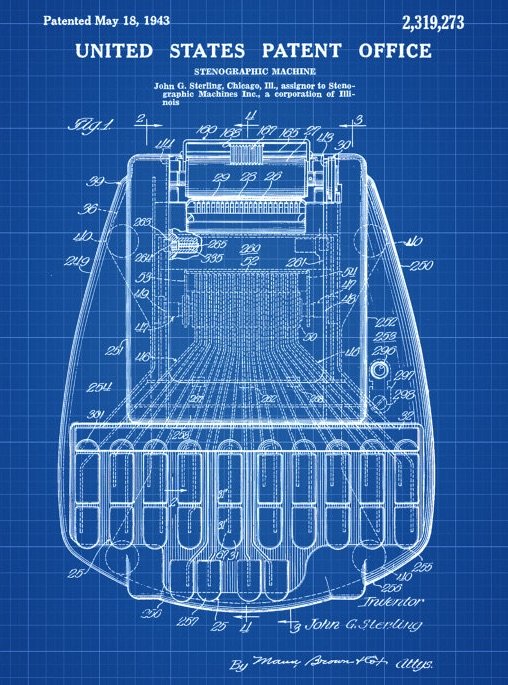 Robert Wright doesn’t mention John G. Sterling in his account of the Stenograph’s origins, but it was Sterling who actually applied for several of the key early patents (under license to Stenographic Machines Inc.) and was credited as the machine’s first inventor. In a 1939 patent application, Sterling laid out in great detail how the new Stenograph would separate itself from the Stenotype and other flawed instruments already on the market.