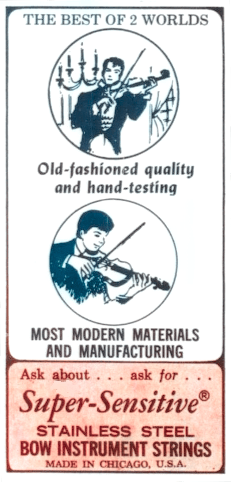 According to the 1998 catalog of the Super-Sensitive Musical String Co., the business “was founded in Chicago, Illinois in 1930 by a violinist who was frustrated by the gut strings of his day. The gut strings would lose their pitch after a very short period of time. After conducting extensive research, he developed a stainless steel string.”