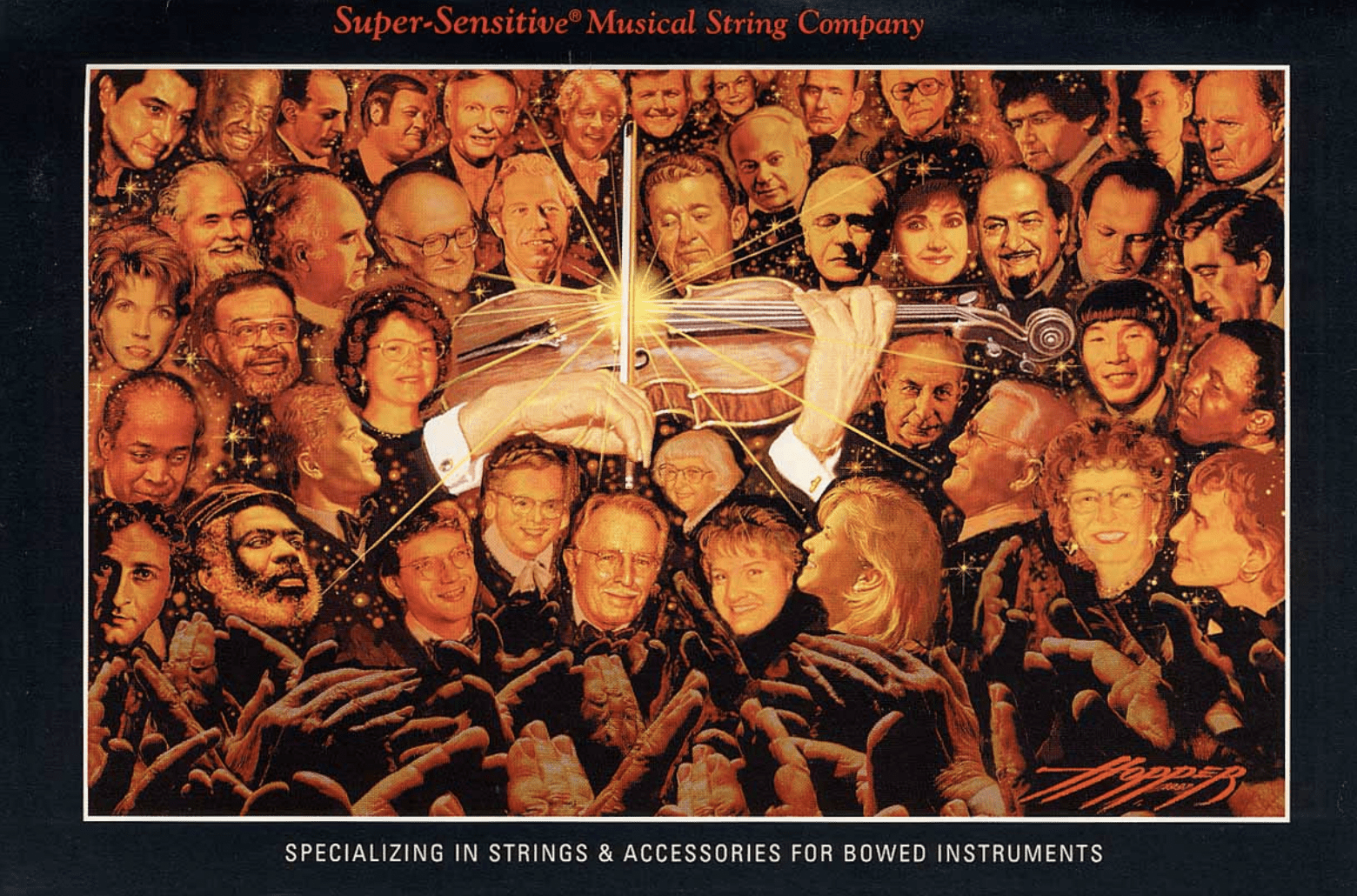 [1998 company catalog cover, featuring artwork by Frank Hopper depicting various users and endorsers of Super Sensitive strings]