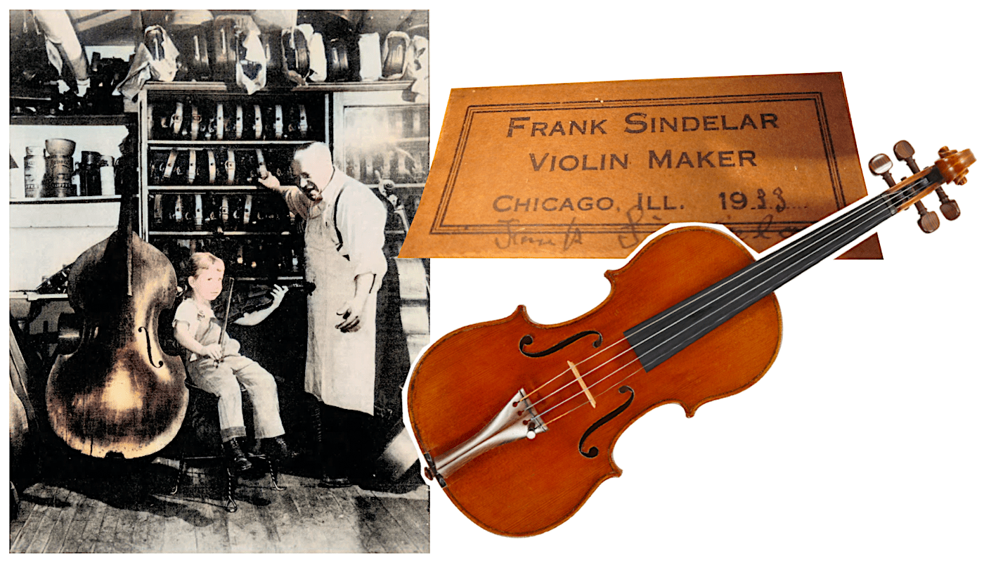 [Left: Frank Sindelar helps out a child prodigy at his Chicago violin shop, c. 1930s. Right: A 1933 Sindelar violin + label]