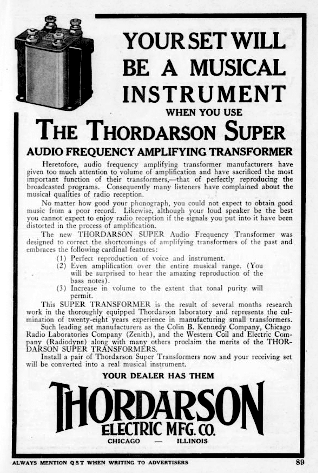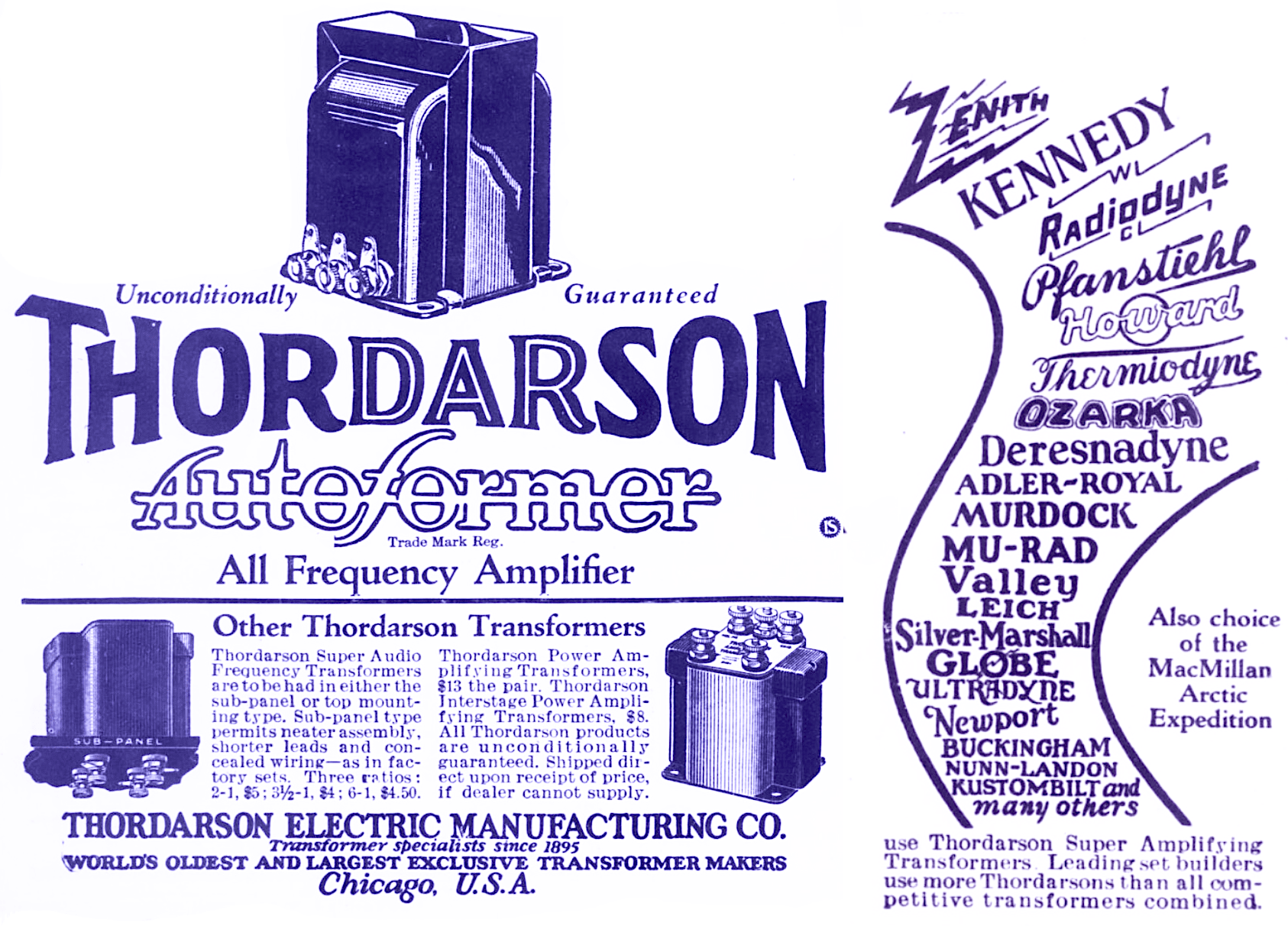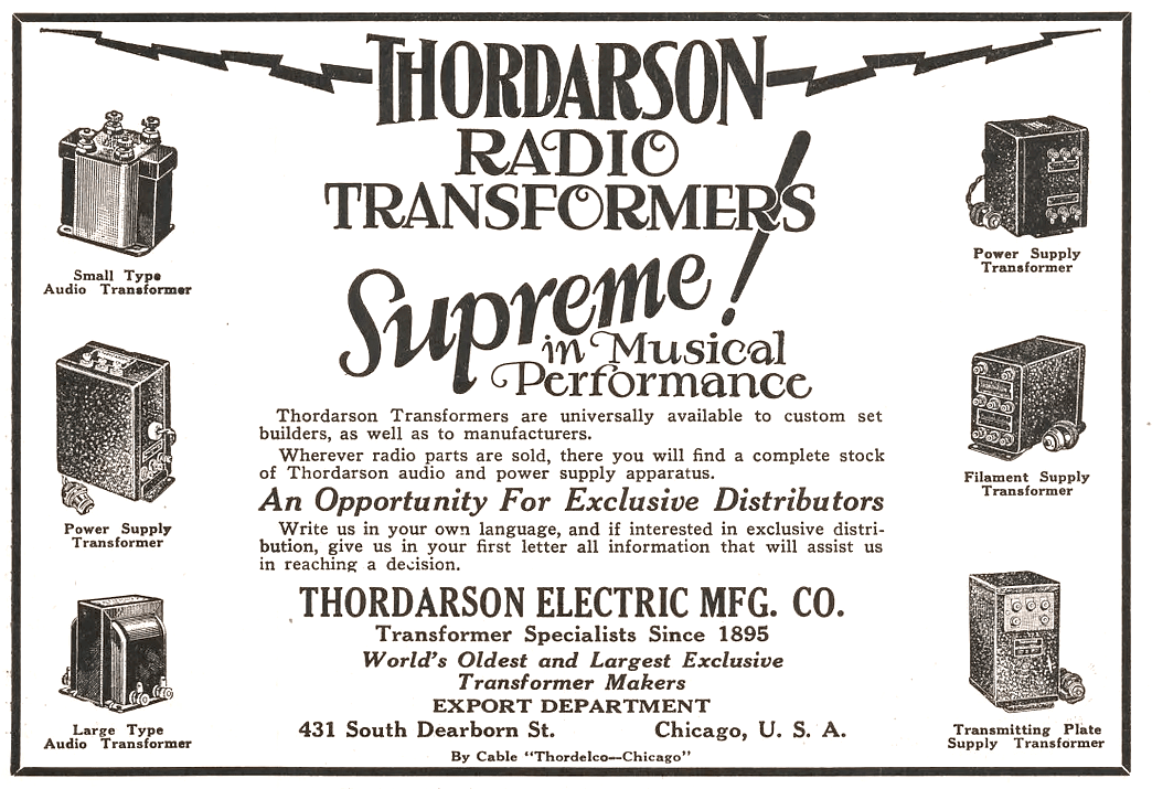 “The trademark of efficiency in wireless transformers is the word THORDARSON on the maker’s name-plate.” –advertisement, 1917