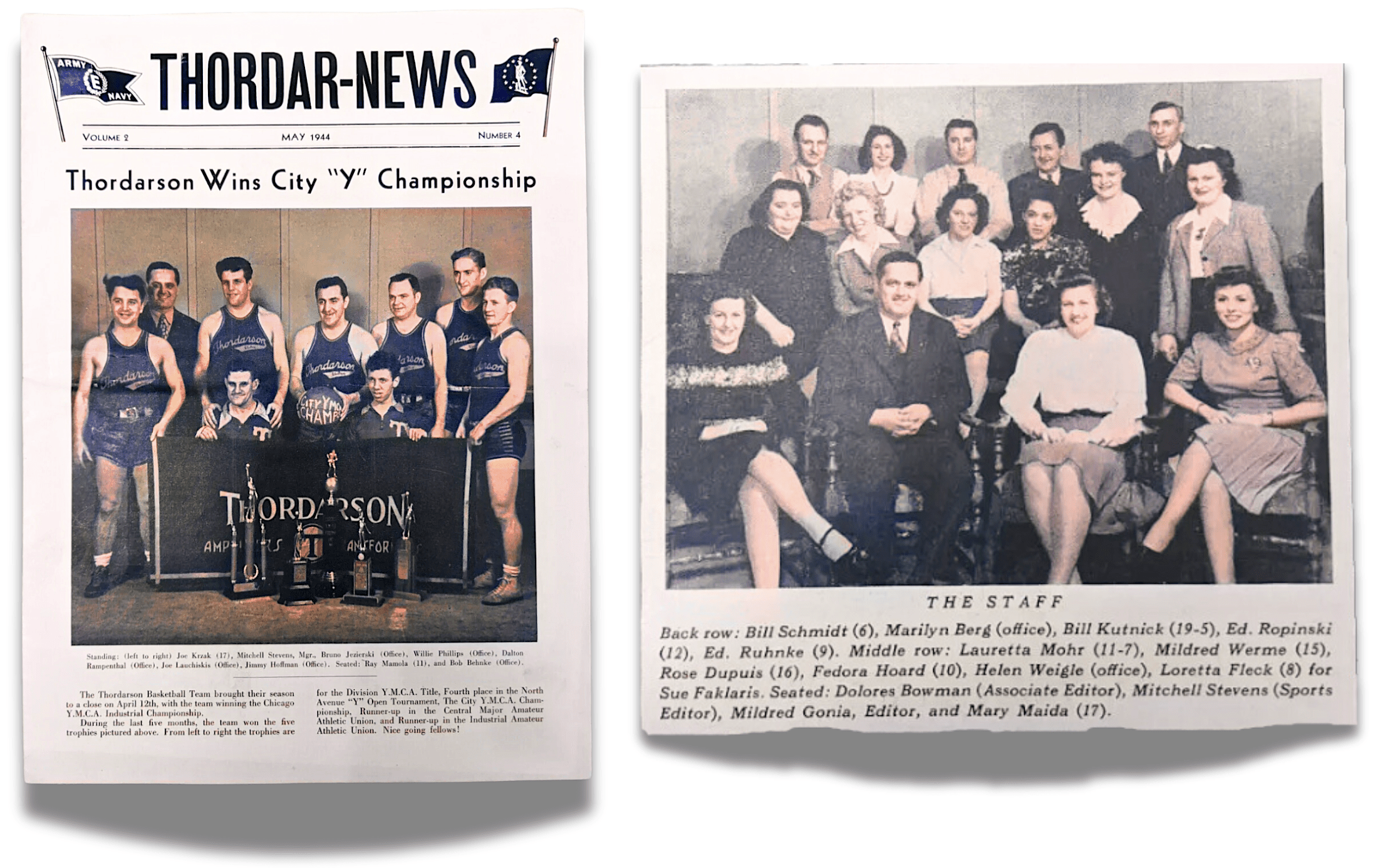 [Left: The Thordarson basketball squad won three straight YMCA industrial league titles during the war years. Right: The staff of the Thordar-News kept the newsletter going not just for the workers in Chicago, but for those who’d left their jobs to serve in the war.]