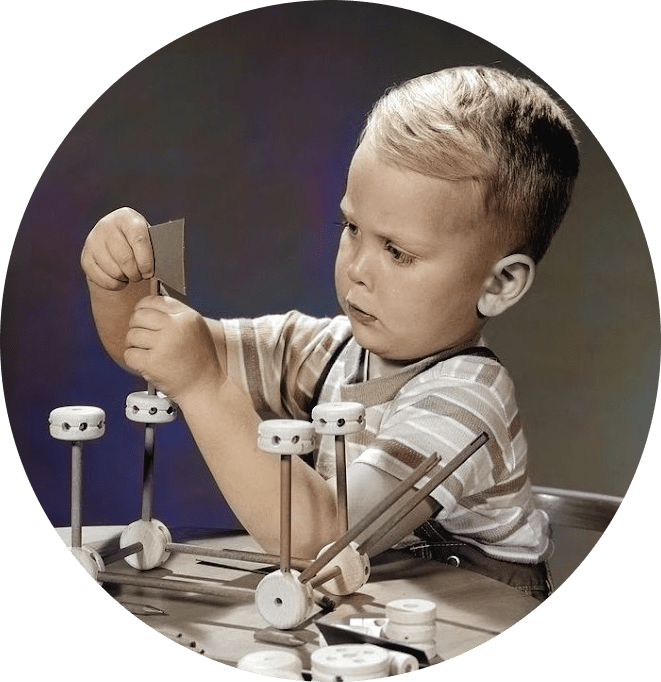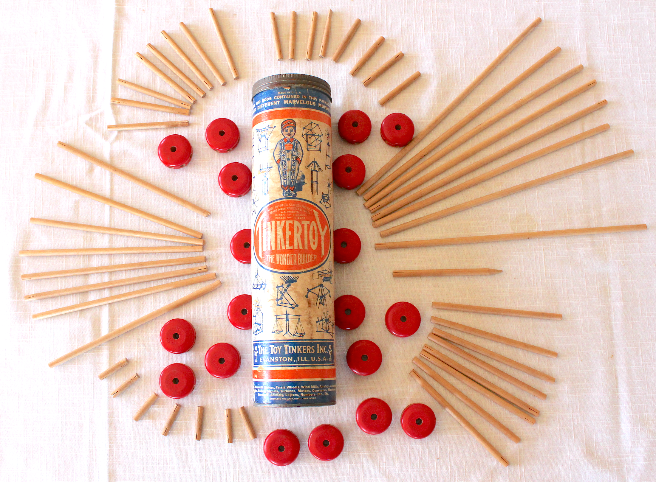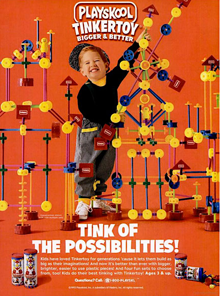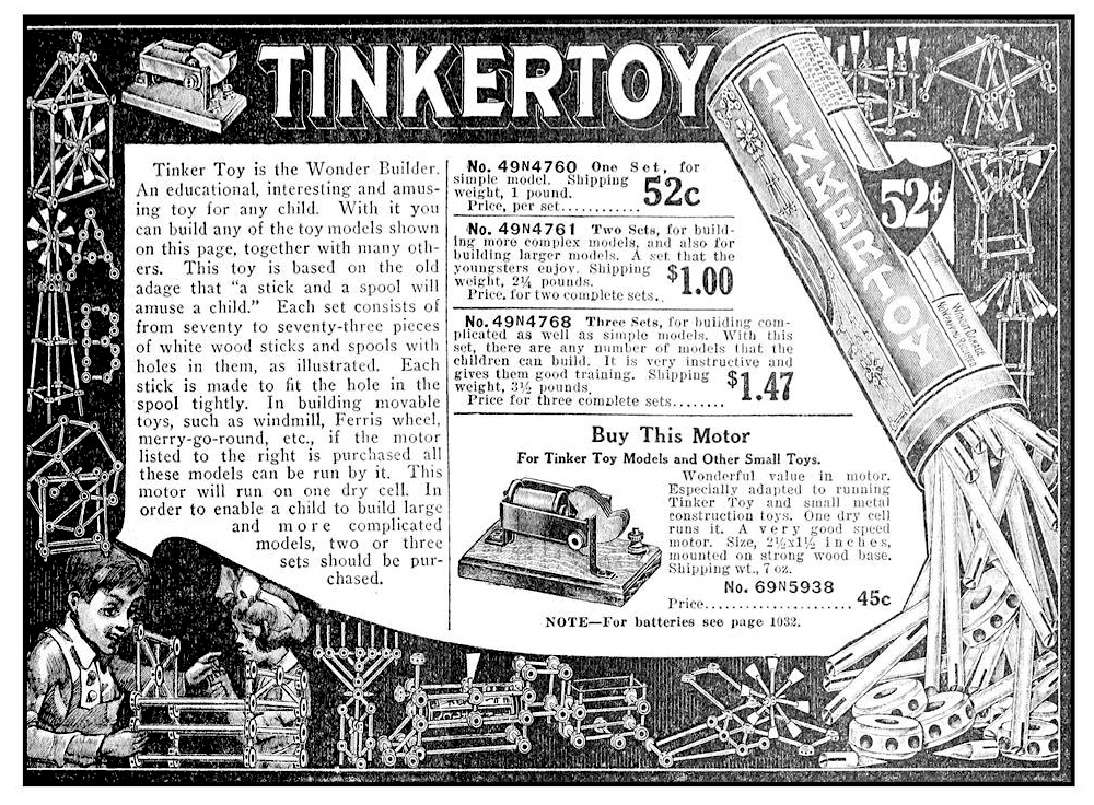 “Tinkertoy, the Wonder Builder, is designed for boys and girls from five to eighty-five! The set comprises 73 wooden spools and rods from which all kinds of moving and stationary figures can be easily constructed . . . each representing in toy form many of the large mechanical and architectural works of the present time. The Tinkertoy Wonder Builder is both entertaining and instructive.” – Tinkertoy ad, 1915