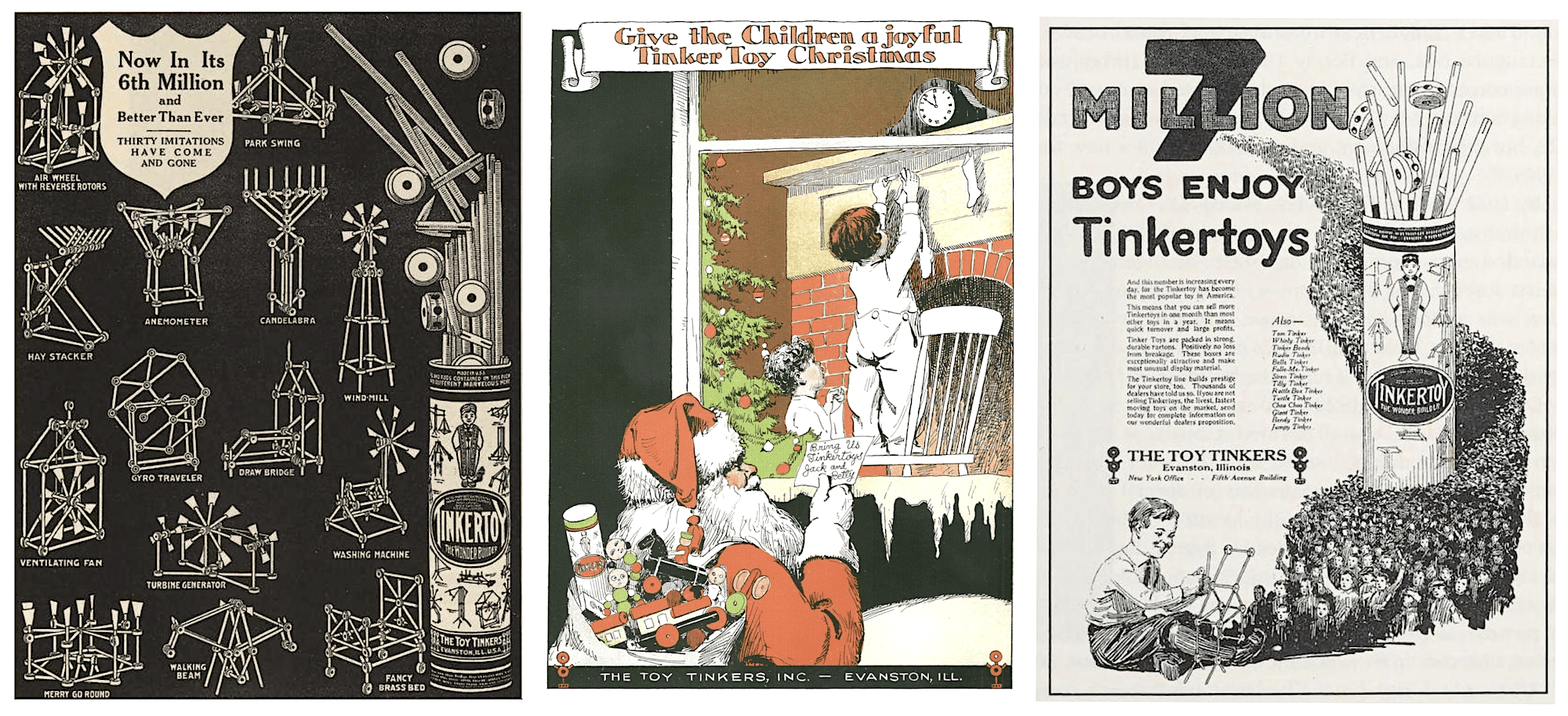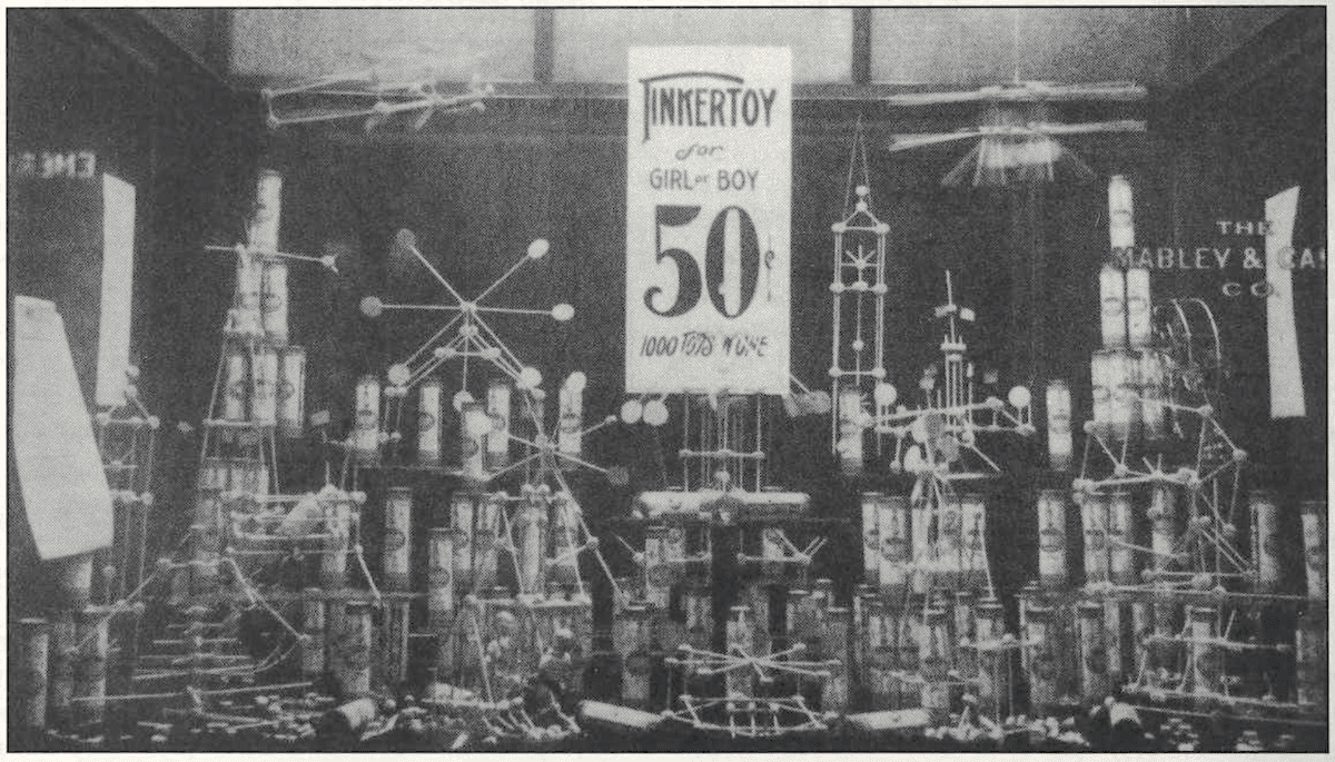 “The Tinkertoy is prominently featured for the coming holiday season,” wrote the Dry Goods Reporter in November of 1915. “Merry-go-rounds, swings, windmills, spinning tops, aeroplanes, automobiles, cranes, etc., are among the interesting things that may be made from the toy; the retail price of which is 50 cents. . . . State Street toy departments have sold hundreds of these toys from window demonstrations. They are interesting in their movements and bright colored flags, and seldom fail to attract the attention of passers-by.”