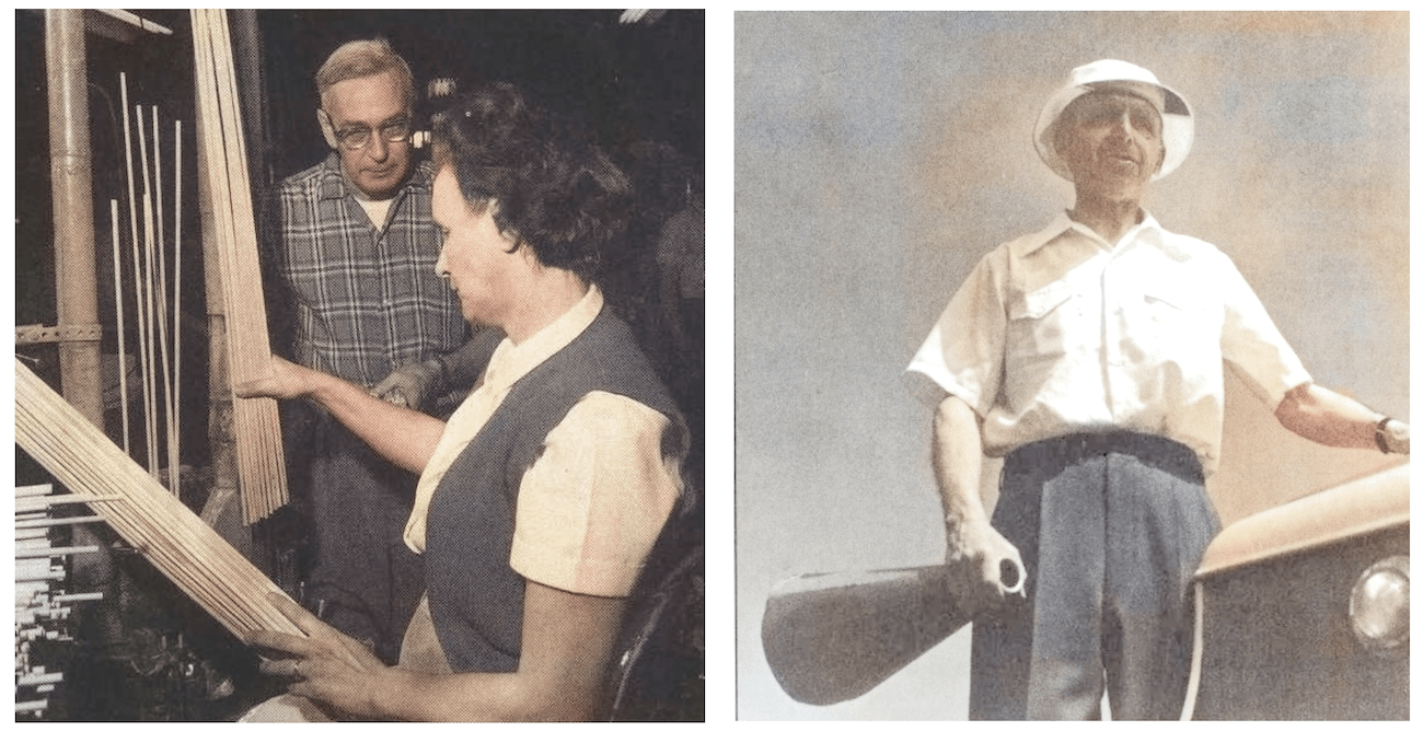 [Left: Fred Hiertz, who joined the Toy Tinkers in 1924, was factory superintendent for many years, and is seen here helping a woman at the stick machine in 1964. Right: Charles Pajeau photographed at the Sheridan Shore Yacht Club in the 1940s.]