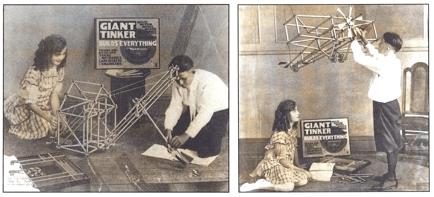 [Above: Charles Pajeau in his workshop, where he hatched ideas for numerous products, including Tom and Belle Tinker, TinkerBlox, and Tilly Tinker the Terpsichorean Queen. Below: Promotional photos of a boy and girl building a plane with the “Giant Ticker” kit, 1920s.]