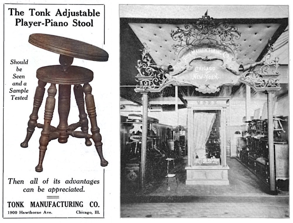 [Left: Later advertisement for Tonk Adjustable Player Piano Stool, 1913. Right: the Tonk exhibit at the 1893 World’s Columbian Exposition]