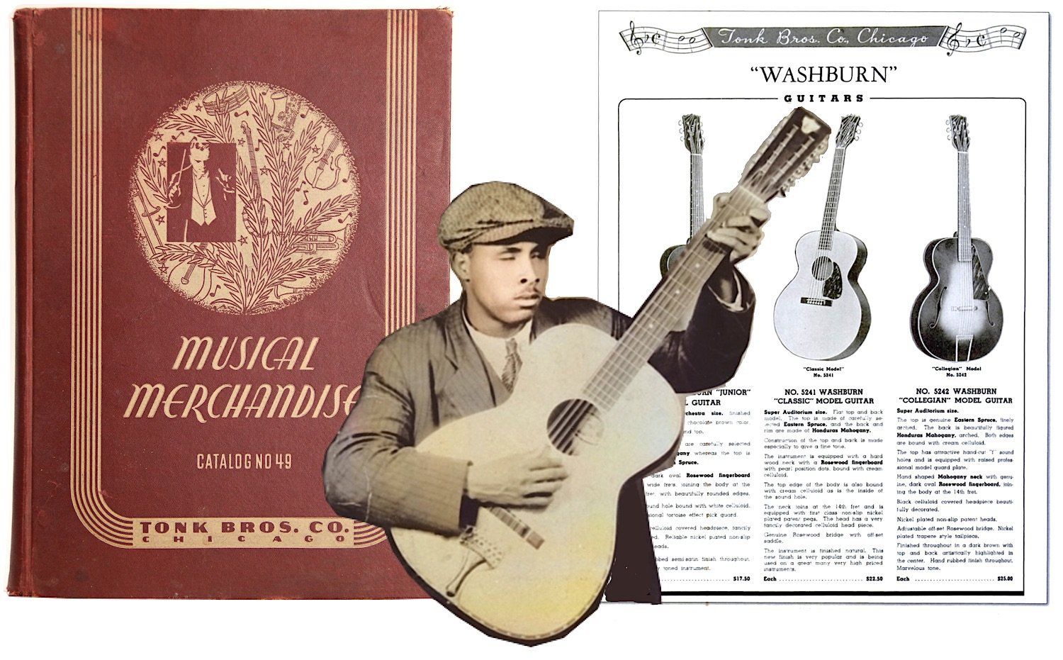 [Tonk became an exclusive dealer of Washburn guitars after acquiring the Lyon & Healy merch department in 1928. Pictured is bluesman “Blind” Willie McTell, playing a Tonk 12-string, likely manufactured by Chicago’s Regal Musical Instrument Co.]