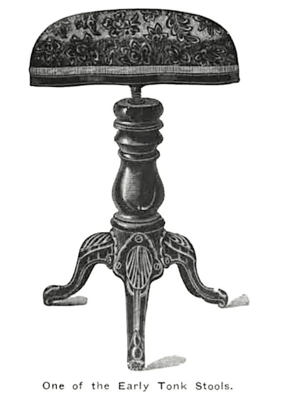 During this era, harmoniums and pump organs were the common keyboard instruments of the home (space-efficient upright pianos hadn’t yet become widely available), and dealers rarely included stools along with them; so the Tonk MFG Company filled a significant need. Max, who bought out Mr. Seaver’s shares after a few years, even managed to collect a patent on an otherwise standard-looking two-legged stool, when his attorney “conceived the idea of proving how strong it was.”