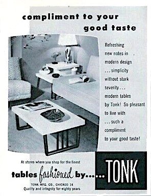 The Tonk MFG Co. remained a leader in piano benches through the 1920s, opening a second factory in Los Angeles, and continued in business into the 1960s, having shifted into more general mid-century modern household furniture, such as coffee tables and revolving cocktail tables (some designed by C. E. Waltman of Chicago).