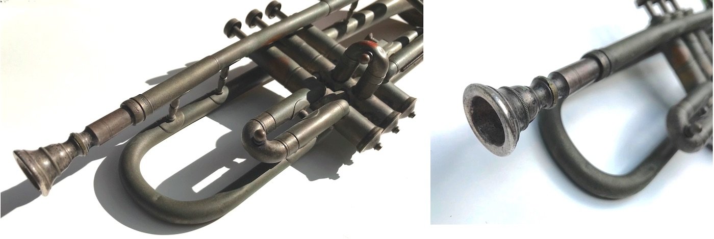 While it’s certainly bent-up much like the instrument mentioned above, the Tonk Brothers “Sterling” horn in our museum collection is sadly NOT the one once wielded by a teenage Louis Armstrong . . . at least, I’m fairly certain it’s not. Nobody knows where Satchmo’s fabled pawn shop Tonk ended up once he chucked it for a better model 100 years ago, so who’s to say?