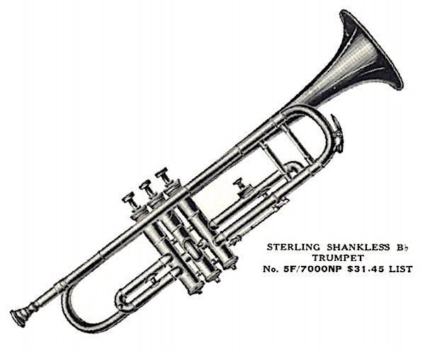 The “Sterling” name, which appears on the Tonk Bros. trumpet in our museum collection, came to prominence in the 1920s, and it appears to have originated from an existing brand of strings that Tonk acquired in 1919. From there, the company used the name liberally on a broad line of products, as the 1922 catalog advertised not just Sterling cornets, slide trombones, baritones, and basses, but also accordions, guitars, and flat-back mandolins under the same banner.