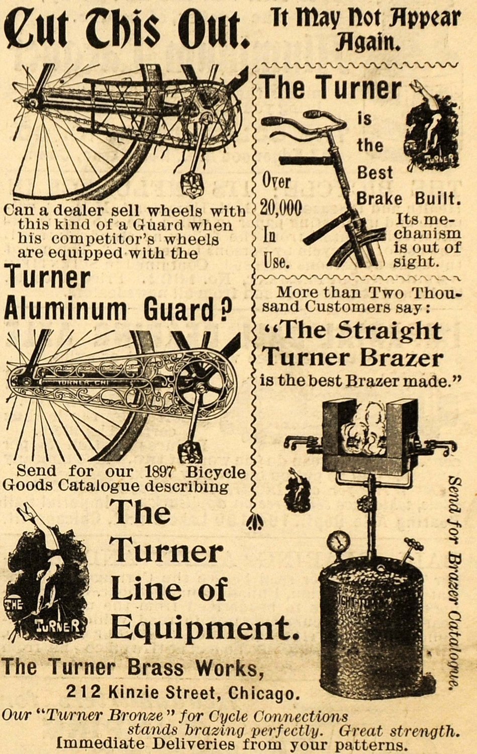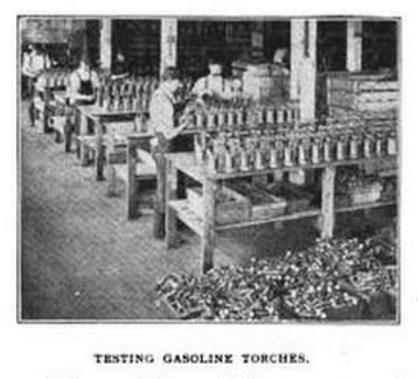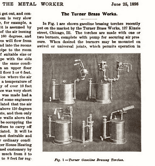 “All of the blow torches put out by the Turner Works are unexcelled for tool room purposes,” quotes the Manufacturing and Wholesale Industries of Chicago, 1919, “being quick in operation, convenient and economical. They are extensively used by machinists, toolmakers, and bicycle manufacturers, and in repair work, for annealing, heating tools, hardening and brazing articles that require great heating power.”