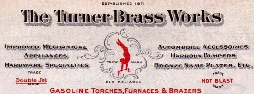 Turner’s own 1905 torch catalog describes the Chicago business, with the addition of the White MFG Co. arsenal, as the “largest concern in the world engaged in the manufacture of up-to-date improved gasoline, kerosene, alcohol and gas appliances,” and mentions separate catalogs available for automobile specialties, hardware, name plates, gas vapor and arc lamps, brass figures, and more.