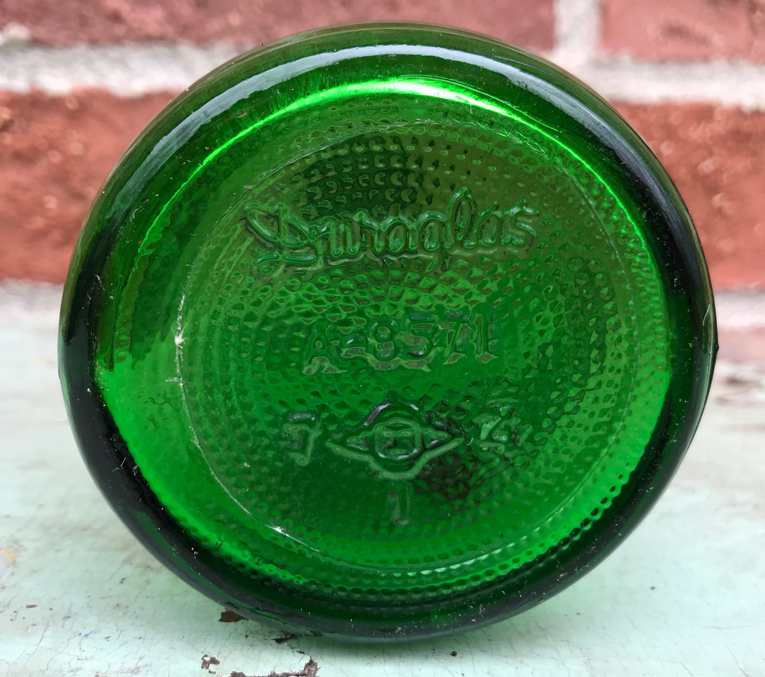 This is the logo featured on our the label of our museum artifact, a one-pint green Duraglass bottle dating from the early 1950s, when the Plastone Company manufacturer name was still in use.