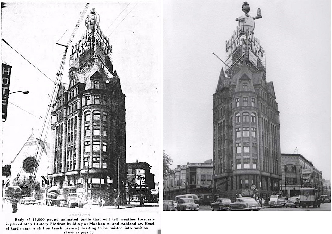 [“Turtle Square” at the intersection of Ashland, Madison, and Ogden Ave. The giant Turtle Wax sign is believed to have been lost when the Flatiron building itself was leveled in the late 1960s]