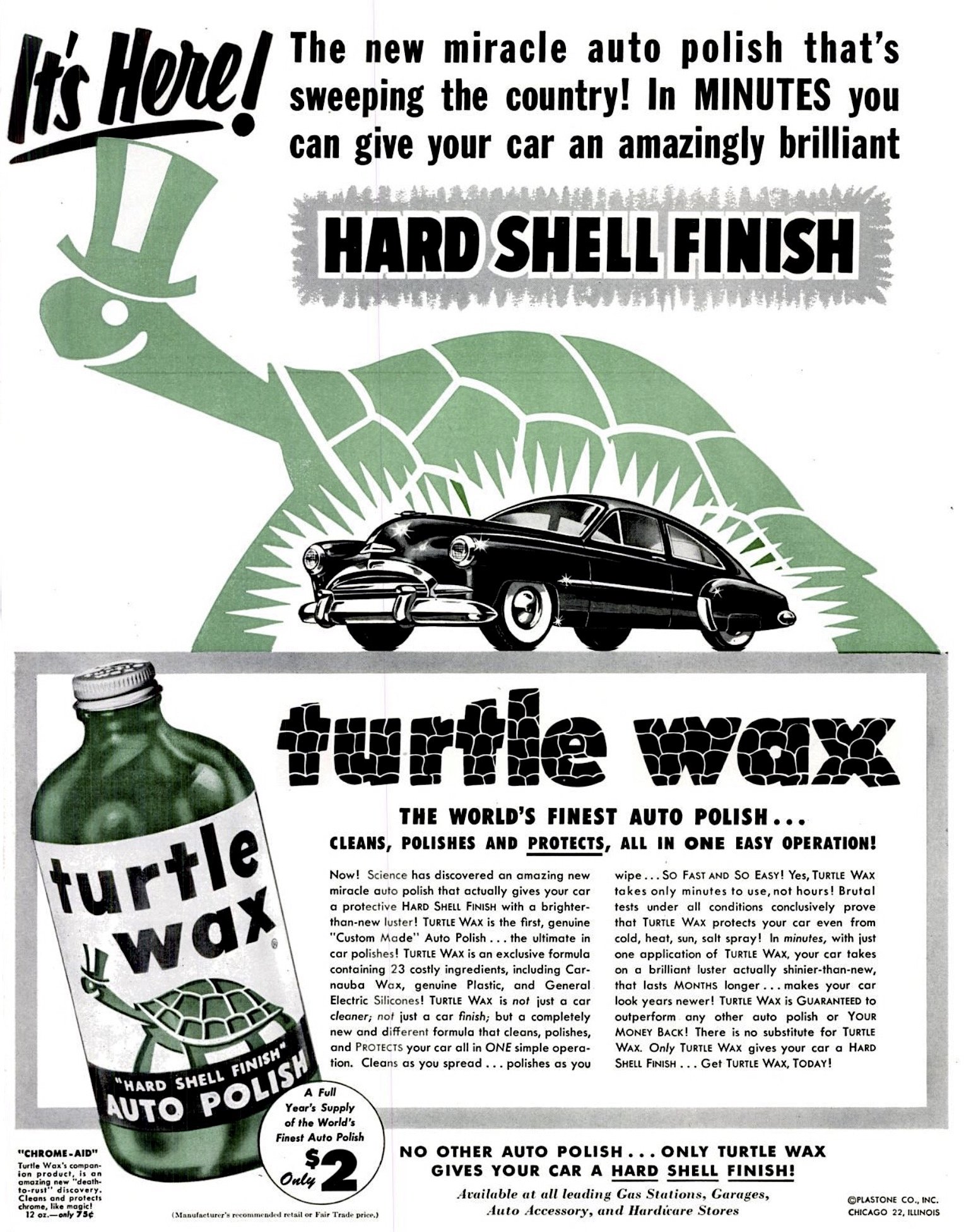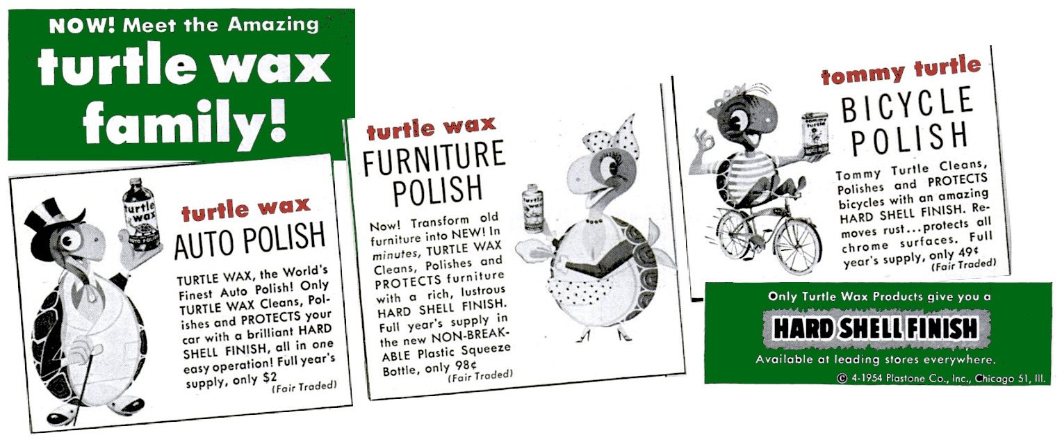 “Now! Science has discovered an amazing new miracle auto polish that actually gives your car a protective Hard Shell Finish with a brighter-than-new luster! Turtle Wax is not just a car cleaner, not just a car finish, but a completely new and different formula that cleans, polishes, and Protects your car all in ONE simple operation.” —Turtle Wax advertisement, 1953
