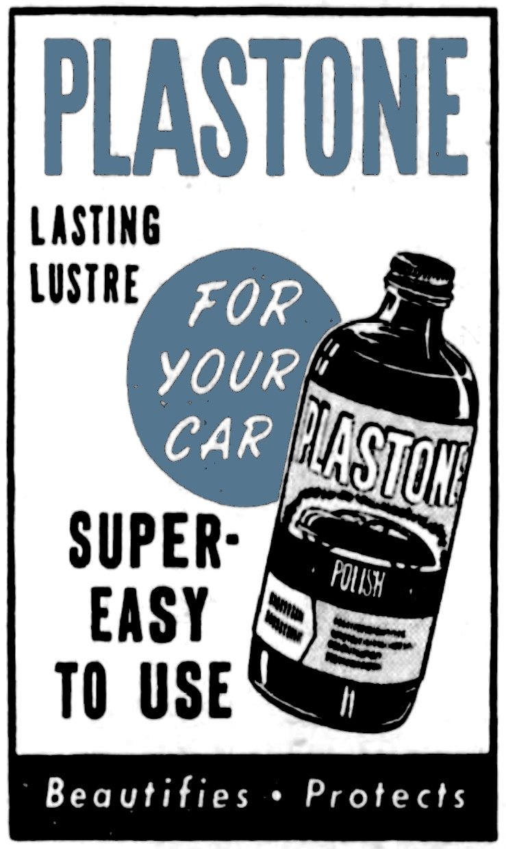 “No other auto polish—ONLY PLASTONE contains 100% Carnauba Wax, Genuine Plastic, plus SILICONES! PLASTONE is not just a car cleaner, not just a car finish, but an exclusive scientific formula that cleans, polishes and protects your car all in one quick simple operation.” —advertisement for Plastone Auto Finish, 1950