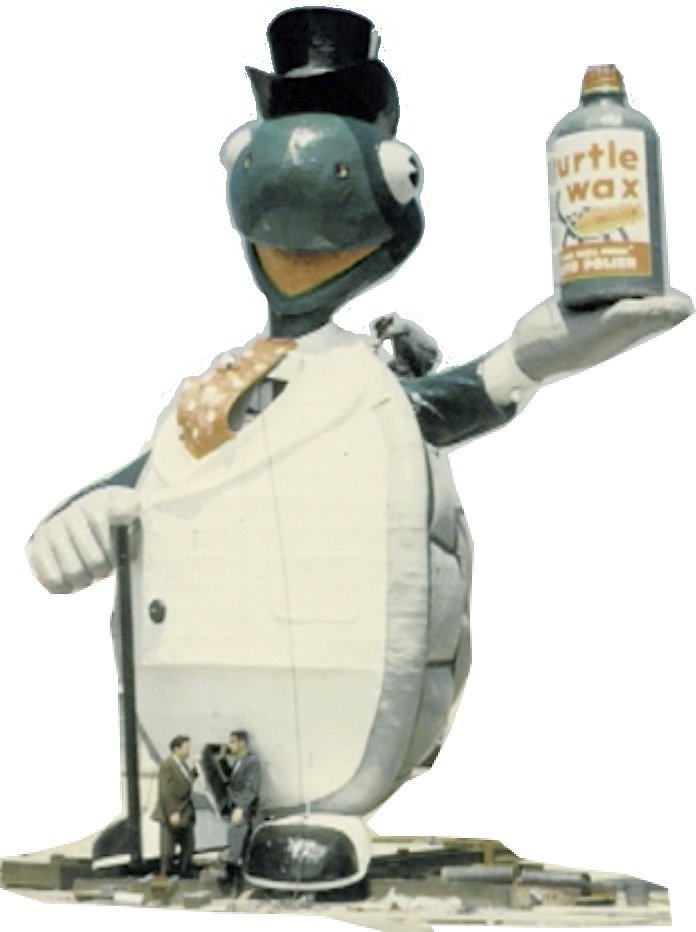 Adorned with a top hat and proudly holding up a man-sized bottle of car wax in his outstretched left hand (upper foot?), this “super turtle” also rotated 360 degrees on a steel column; told the time; and magically changed color to communicate impending variances in the local weather. “Red will forecast warmer weather; blue, cold weather; white, rain or snow; and green for no change. There’s never been anything like it before!”