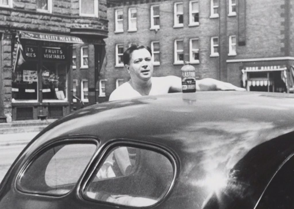 [Ben Hirsch posing with a bottle of Plastone, late 1940s]