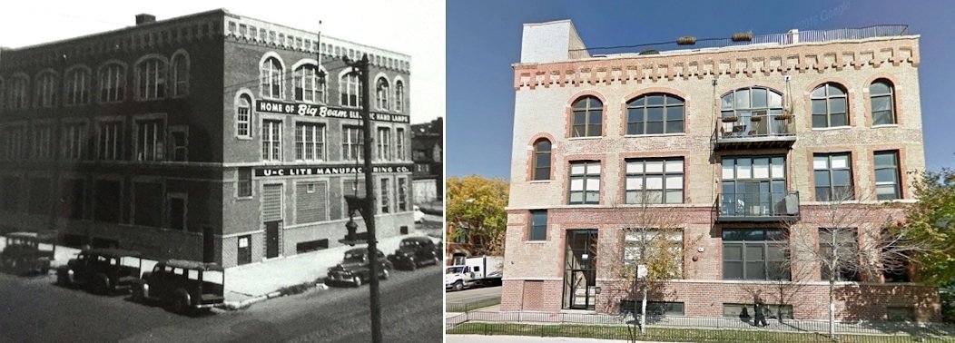 [The former Big Beam factory at 1050 W. Hubbard St., 1940s vs today]