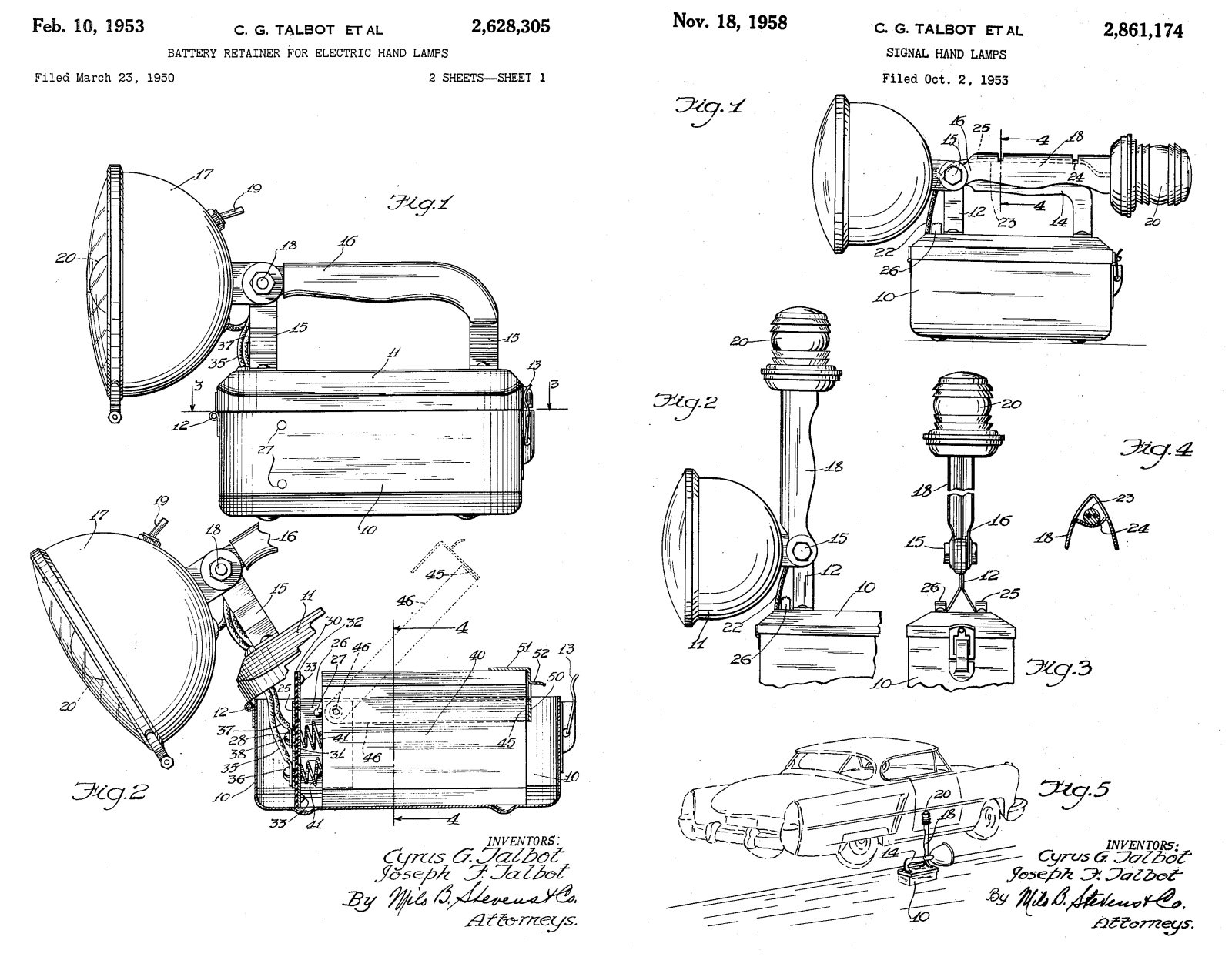 By the mid 1950s, Cyrus Talbot had earned patents on his battery retainer and signal hand lamp design, which included the ability to manually adjust the positioning of both the main headlight and emergency light.