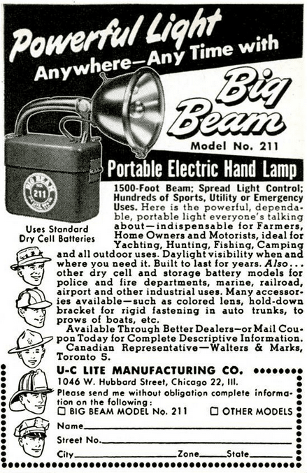 From early on, the power and durability of the Big Beam gave it a very diverse field of logical clientele, including not only the yachtsmen and theater owners who read those aforementioned magazines, but anyone potentially working in dark or dangerous conditions: firefighters, electricians, security guards, campers, motorists, train conductors, etc.