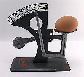 According to Charley Amsbaugh’s book North American Egg Scales: From ABC to Zenith, “During World War I, the U.S. War Department bought chicken eggs in large quantities to feed the troops overseas. The War Department’s use of size classifications—Small, Medium, Large, Extra Large, and Jumbo—to determine the prices to be paid for the eggs created an instant need for egg scales to indicate how much an egg weighs, which is how eggs are classified as to size. During the Great Depression, selling eggs was one of the few sources of cash money for many farm families, and grocery stores and egg processing plants paid a premium for sorted eggs, perpetuating the demand for more and cheaper egg scales. . . . While only a few companies were making egg scales in the early 1920s, many more sprang up through the 1930s and ’40s, and nearly every American family that raised chickens had an egg scale by the 1950s.”