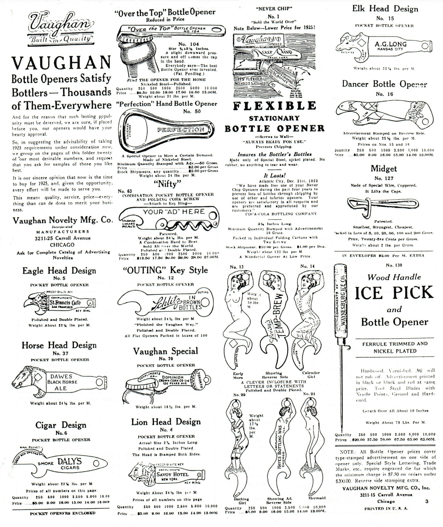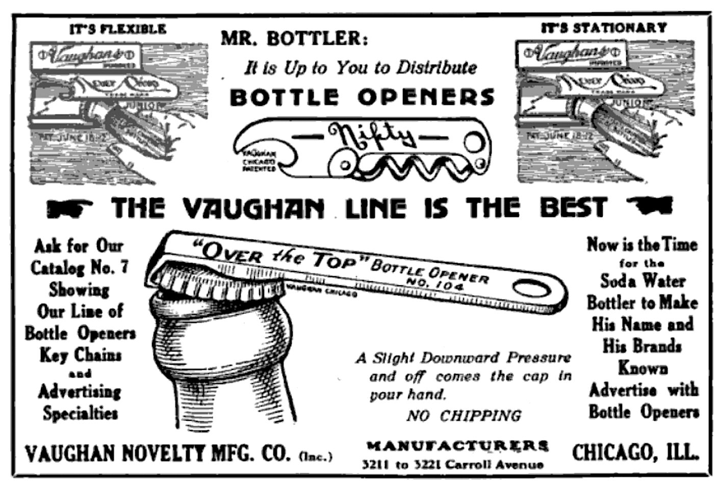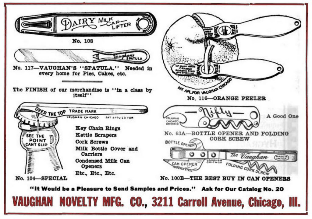 “Now is the time,” a 1922 Vaughan ad claimed, “for the soda water bottler to make his name and his brands known. Advertise with Bottle Openers.”