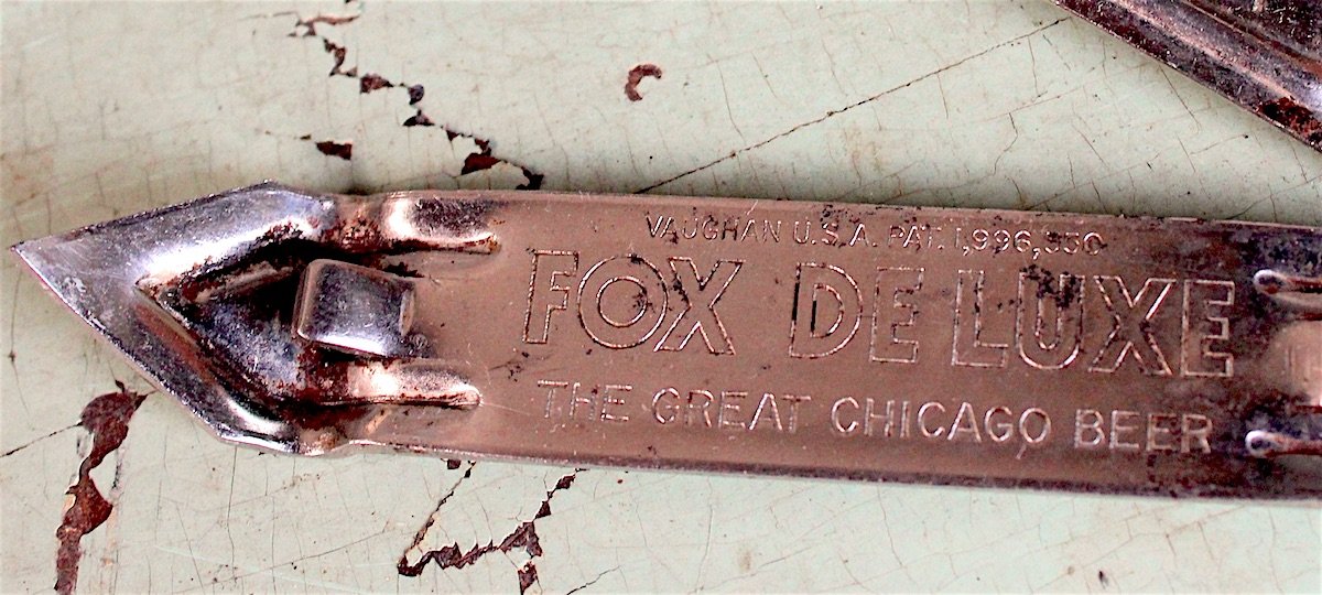 We can pretty easily surmise that the particular Fox DeLuxe + Vaughan artifacts in our museum collection were made in the late 1940s or early ‘50s. Metal rationing had made both beer cans and can openers relatively obsolete during the war years, and the Peter Fox Brewing Company went out of business by 1955, so we’re left with a fairly small window for these things to have been commissioned. We can also verify that Fox was using its “Great Chicago Beer” slogan during the same era, bringing the timeline together.