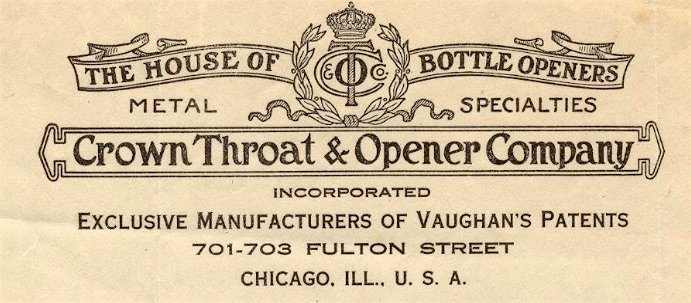 You can’t help but appreciate Harry Vaughan’s gumption; not just for starting his own company, but for opting to call it the “Crown Throat and Opener Co.” —a blatant attempt to piggyback off the trusted name of his former employer, Crown Cork & Seal. He would surprisingly keep this name for several years before doing the inevitable re-brand, likely under the threat of legal action.