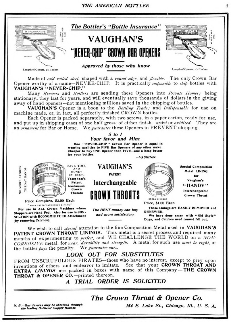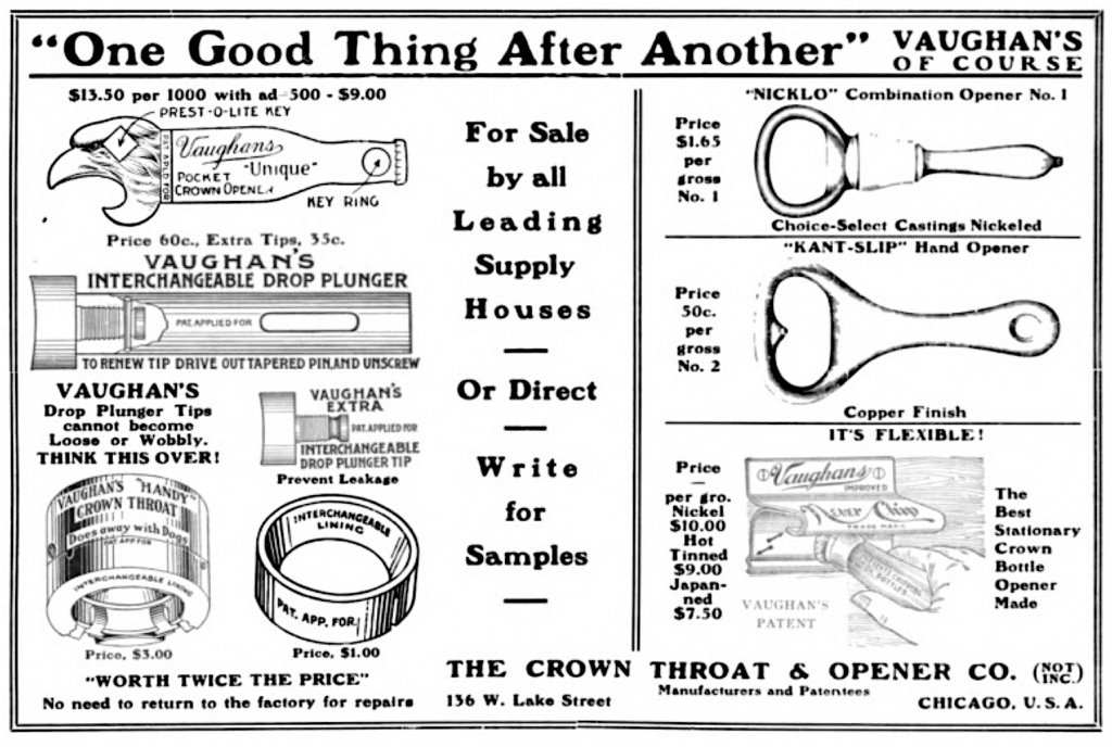 “VAUGHAN’s Opener,” one ad read, “is a boon to the bottling trade; and indispensable for use on machine-made, or, in fact, all perfectly finished Crown bottles.”